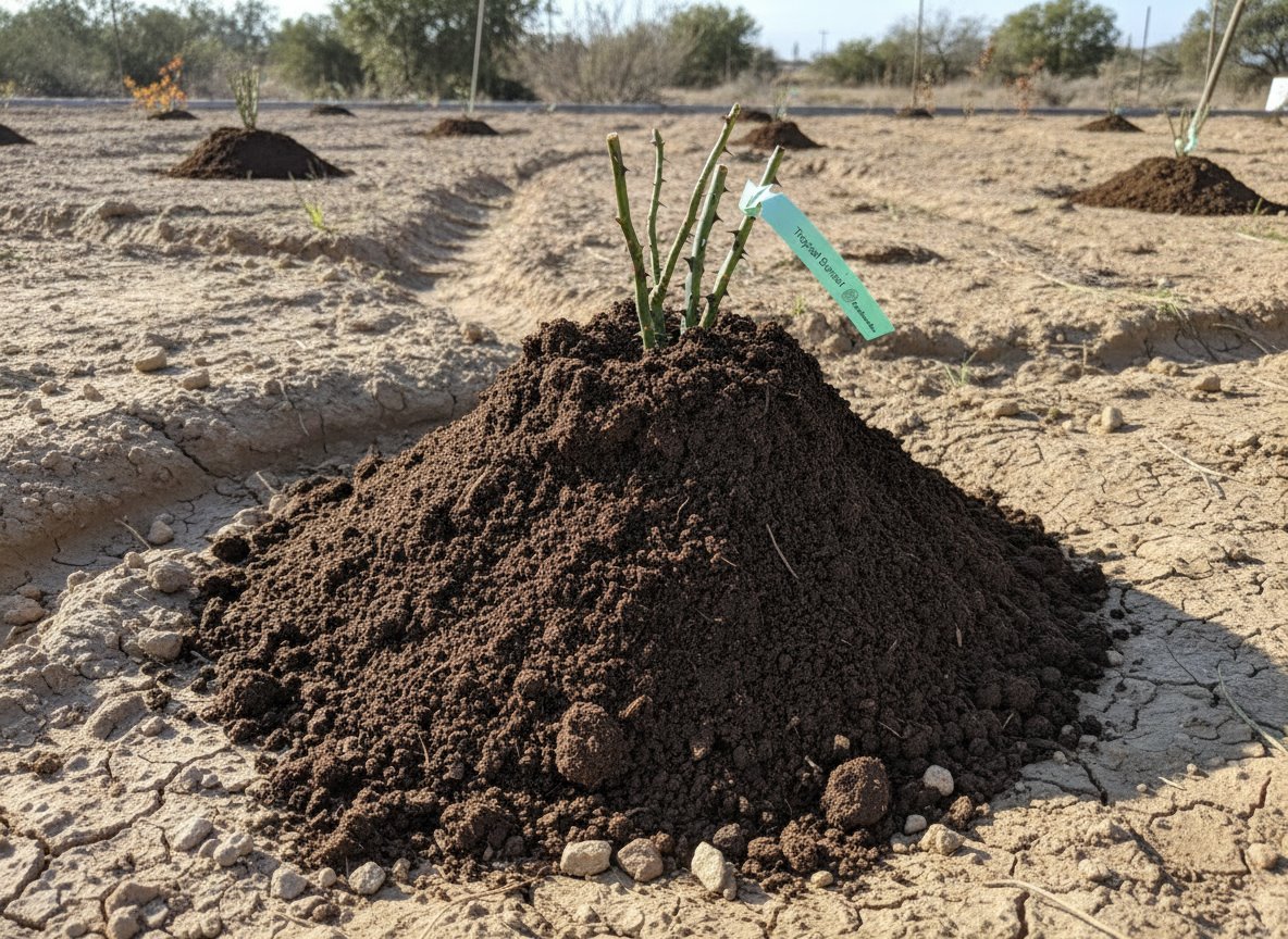 Umieszczamy korzenie w dołku, wszystkie skierowane pionowo. Korona / miejsce szczepienia, powinno być na równi z gruntem, lub jesli mamy lekką ziemię możemy je trochę zagłębić 2-3cm. Stopniowo zasypujemy dołek ziemią i lekko udeptujemy.