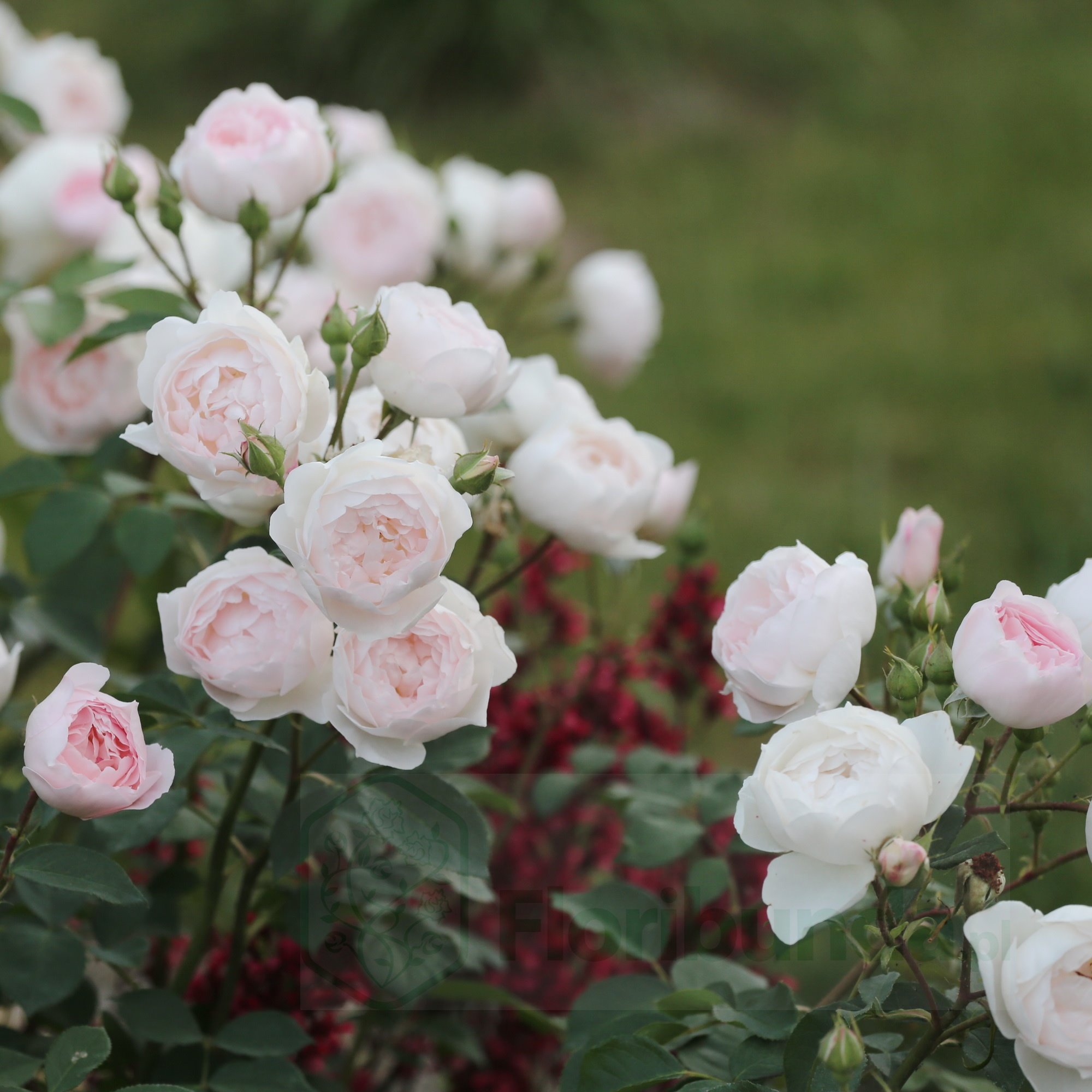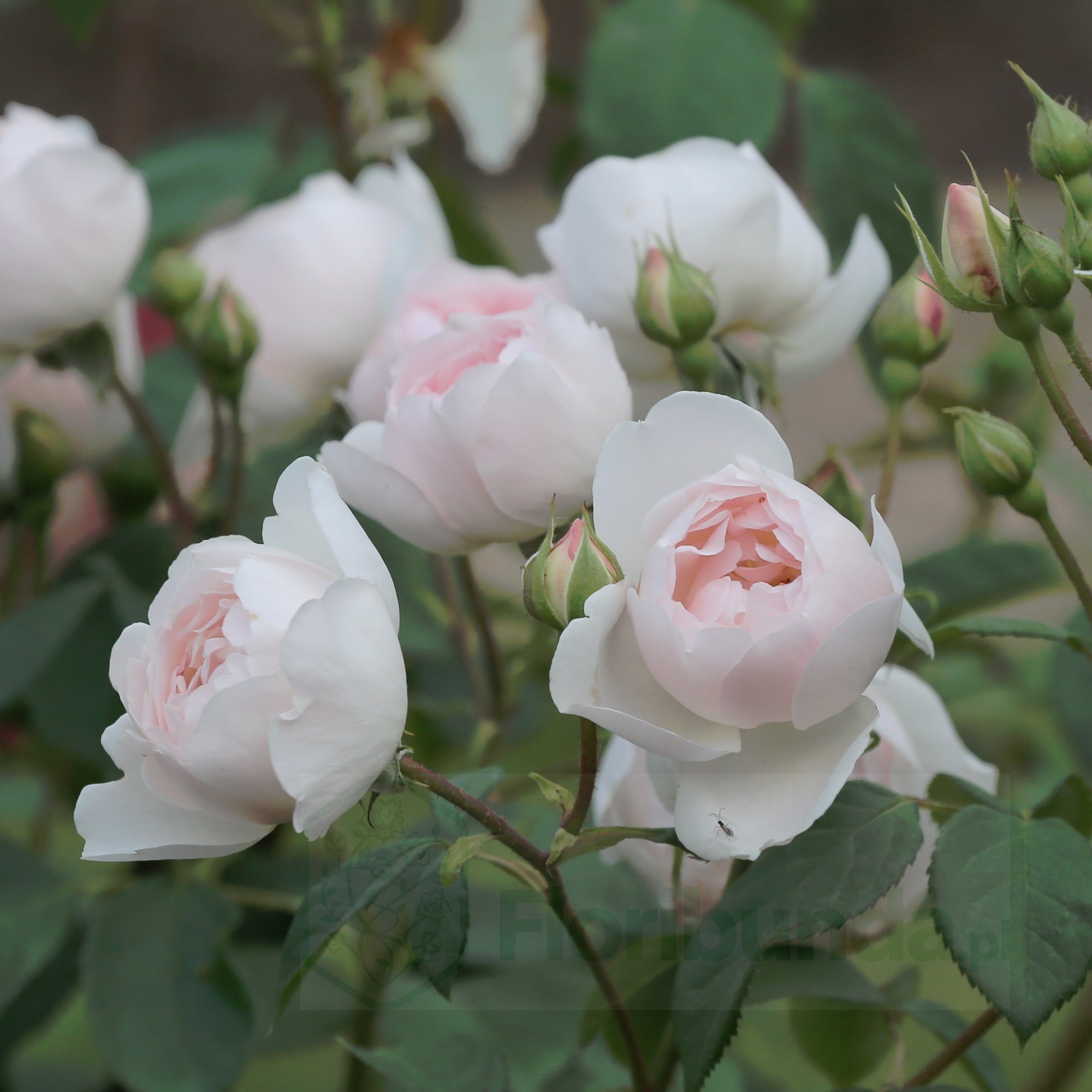 Są one średnich rozmiarów, zebrane po kilka sztuk na jednej łodyżce. Kieliszki kwiatowe rozwijając się traca delikatny różowy rumieniec, przechodząc w kierunku kremu, który w otwartym kwiecie nabiera odcienia kości słoniowej. Wszystko to ukraszone jest delikatnym aromatem.