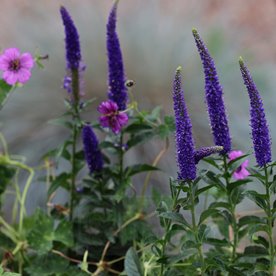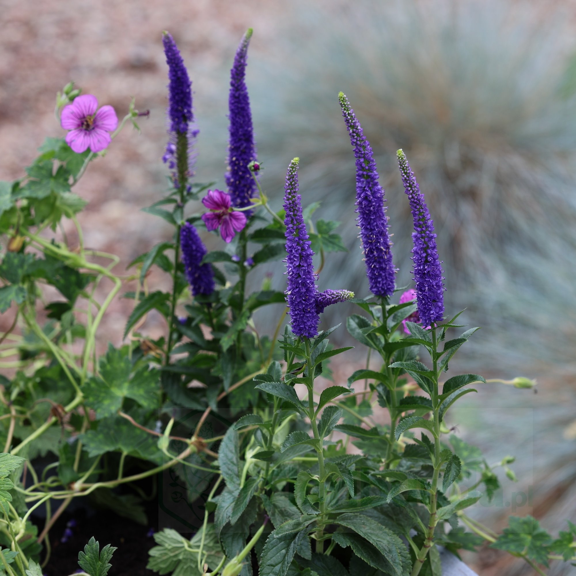 Przetacznik kłosowy 'First Glory' (Veronica spicata ‘First Glory’) to kompaktowa, wyjątkowo ozdobna bylina o intensywnie niebiesko-fioletowych kwiatach, które pojawiają się latem i długo utrzymują się na roślinie. Odmiana ta tworzy zwarte, gęste kępy o wysokości około 30–40 cm i podobnej szerokości. Jej największym atutem są smukłe, pionowe kwiatostany w głębokim, nasyconym odcieniu niebieskiego, które wyrastają ponad ciemnozielone, lancetowate liście, tworząc bardzo elegancki i uporządkowany efekt. Kwitnienie rozpoczyna się w czerwcu i trwa do sierpnia, często powtarzając się po przycięciu.