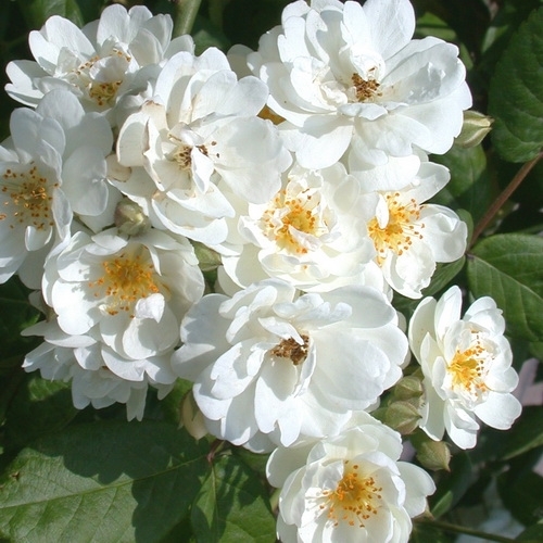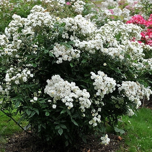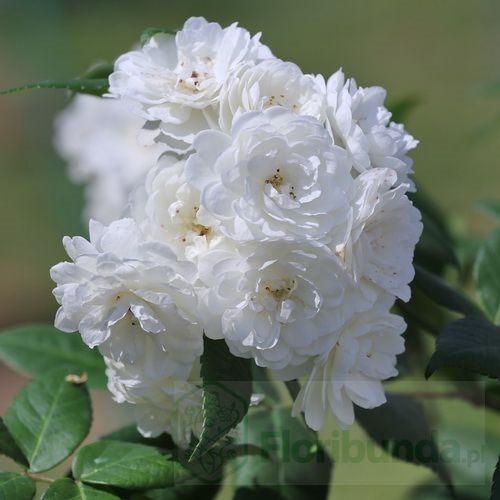 Typowy mieszaniec piżmowy . Taka różana hortensja w ogrodzie w najlepszym tego słowa znaczeniu . Z daleka nawet będzie cieżko odróżnić z jakim gatunkim aktualnie obcujemy. Jednak już z bliska zauważymy że to królowa ogrody bo nawet trochę kolców ma na pędach ale przy tej grupie róż nie są one bardzo uciążliwe. Właściwie można powiedzieć, że cieżko będzie się ukłuć wykonując prace pielęgnacyjne lub ścinając ją do wazonu. Kwiaty są naprawdę maleńkie ale ich lość i skupienie powoduje że nie odczuwamy tutaj jakiegoś braku , wręcz przeciwnie budzi to zainteresowanie i cheć poznania jej bliżej . Śnieżnobiały kolor znakomicie kontrastuje z wąskimi liśćmi w ciemnozielonym odcieniu .